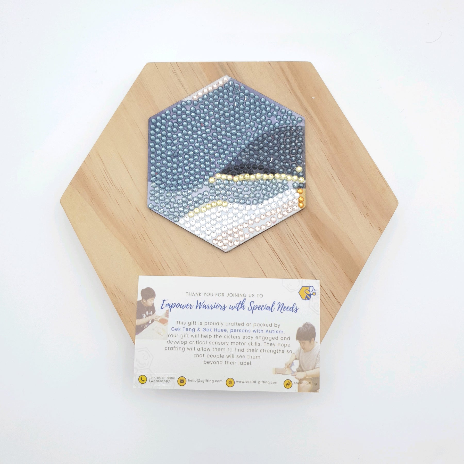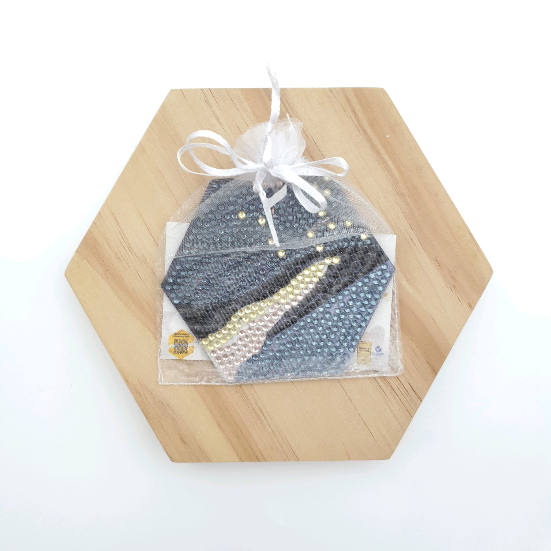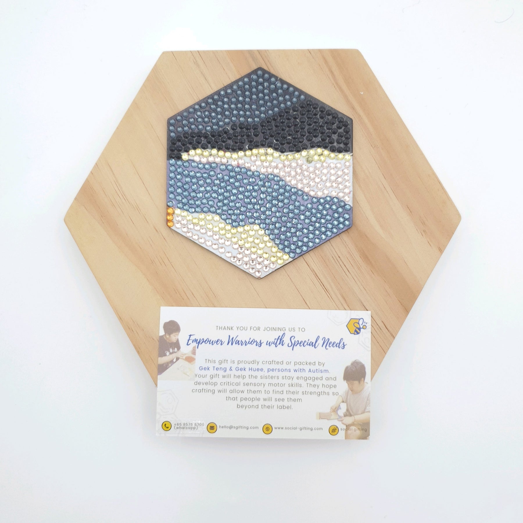 Diamond Art Wooden Coaster Brighten your space with this handcrafted Diamond Art Wooden Coaster, featuring sparkling diamond art embellishments on a sturdy wooden base. This unique coaster protects your surfaces while adding a touch of artisanal charm to your home or office.