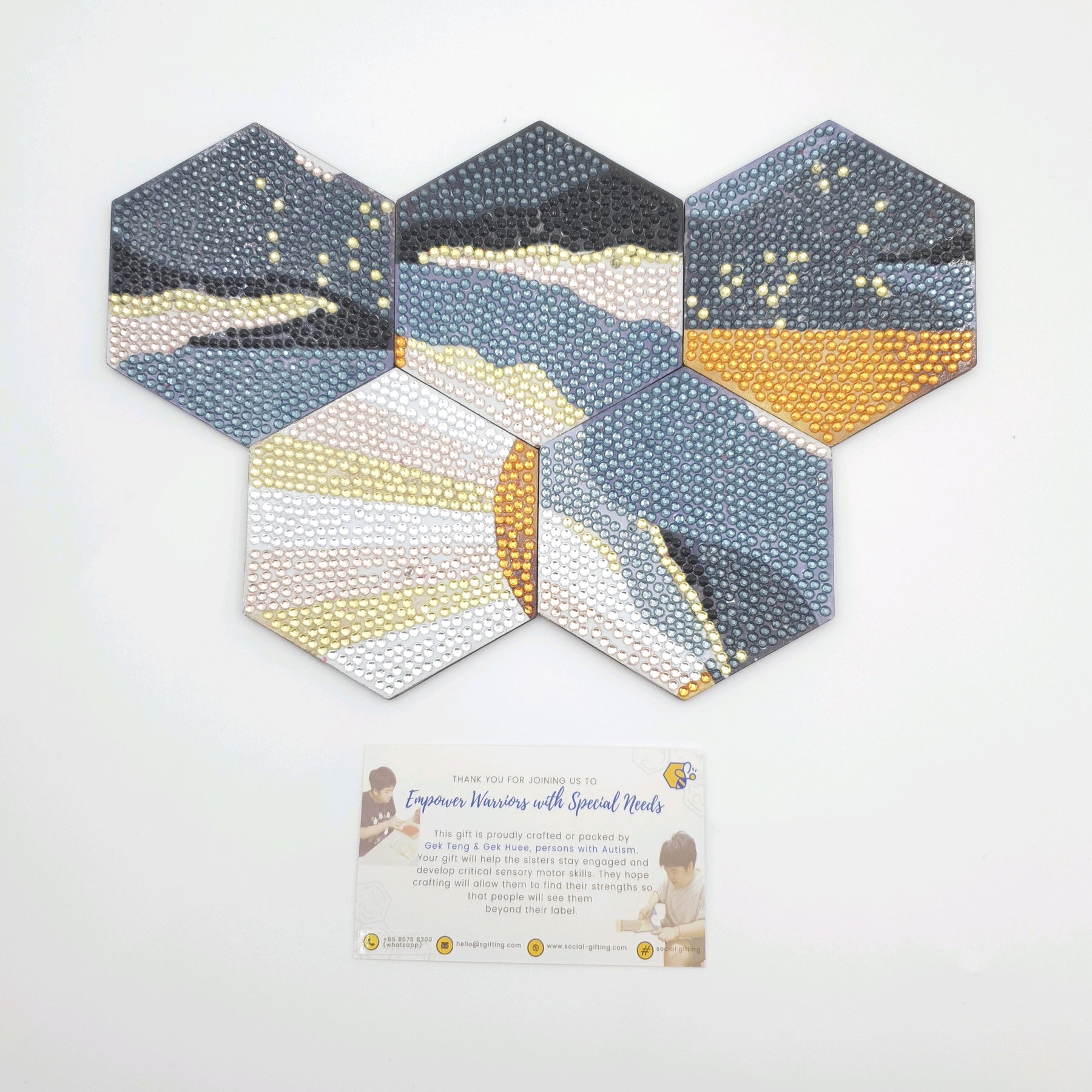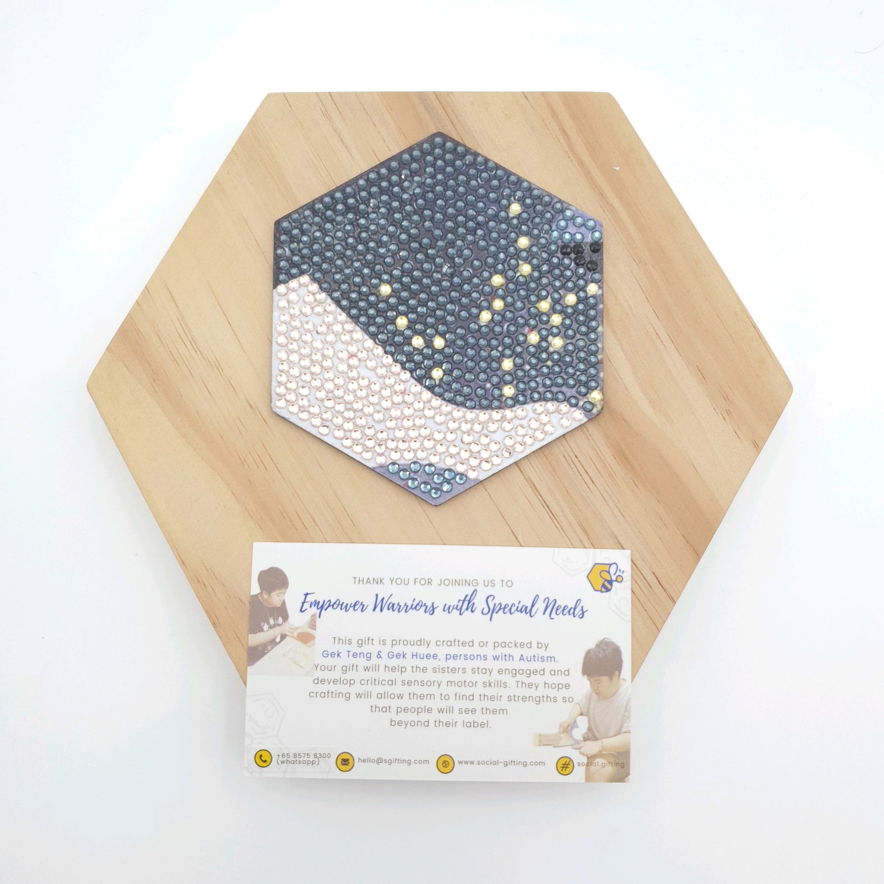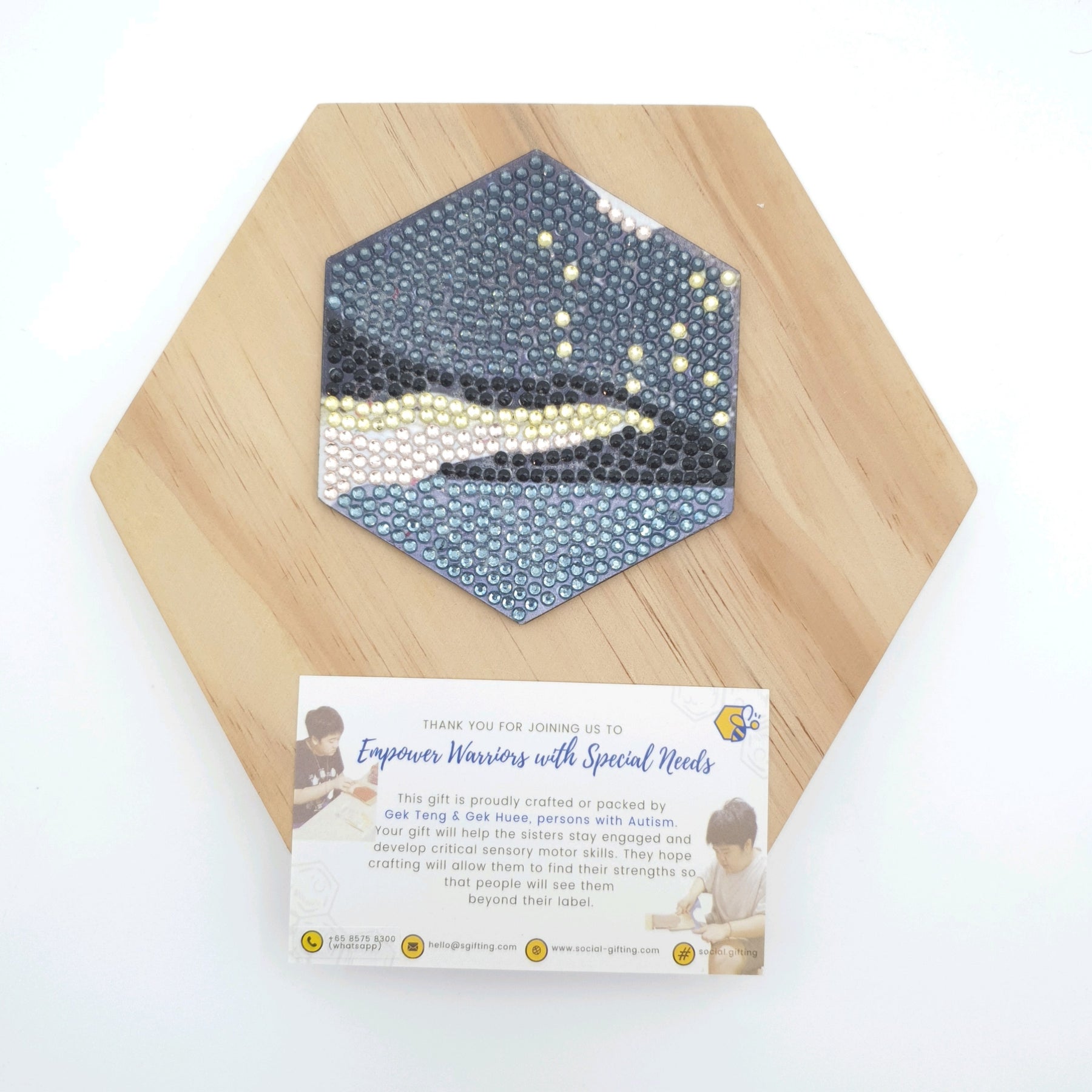 Diamond Art Wooden Coaster Brighten your space with this handcrafted Diamond Art Wooden Coaster, featuring sparkling diamond art embellishments on a sturdy wooden base. This unique coaster protects your surfaces while adding a touch of artisanal charm to your home or office.